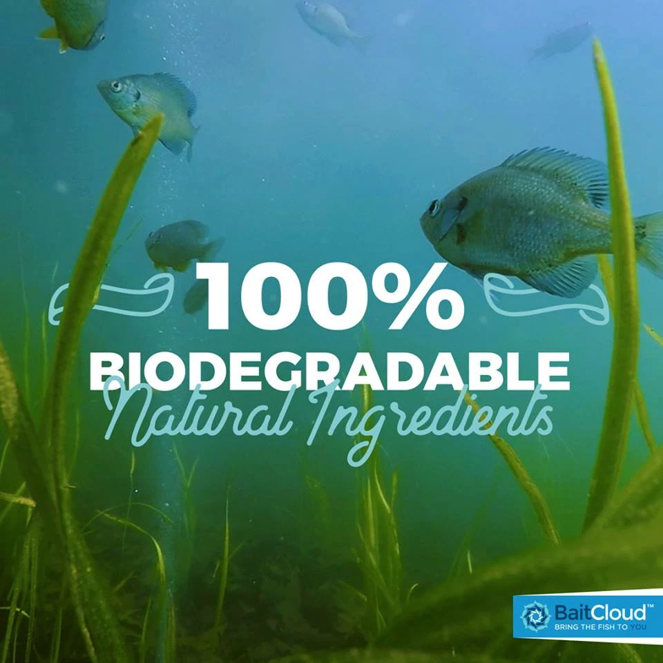 Panfish are primarily visual hunters therefore BaitCloud’s InLine Panfish formula is designed to maximize visual signals. In particular, the bubbles, coloring and Bio-Glitter™ create a visual field drawing fish in.