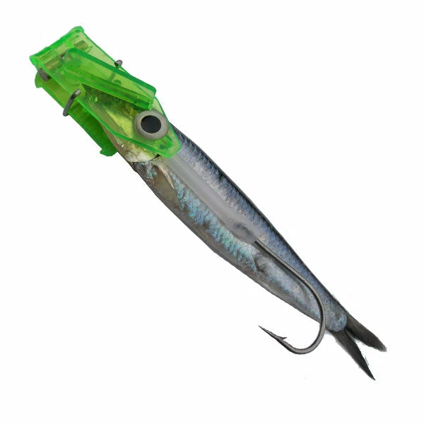 While originally designed for use while trolling for Salmon they can be trolled or used while bottom fishing for many species. The fin on the back of the bait holder head rotates your bait while trolling or fishing in a current. The bait holders head also contains Electronic Bait Technology.