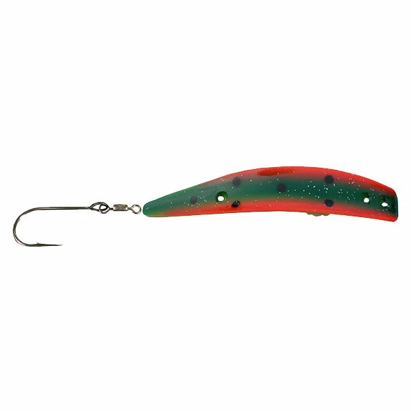To achieve the best action from these trolling e-lures, they should be trolled between 2 and 3 mph. However with their special curve you can troll as slow as 1 mph and they will still shake with good action