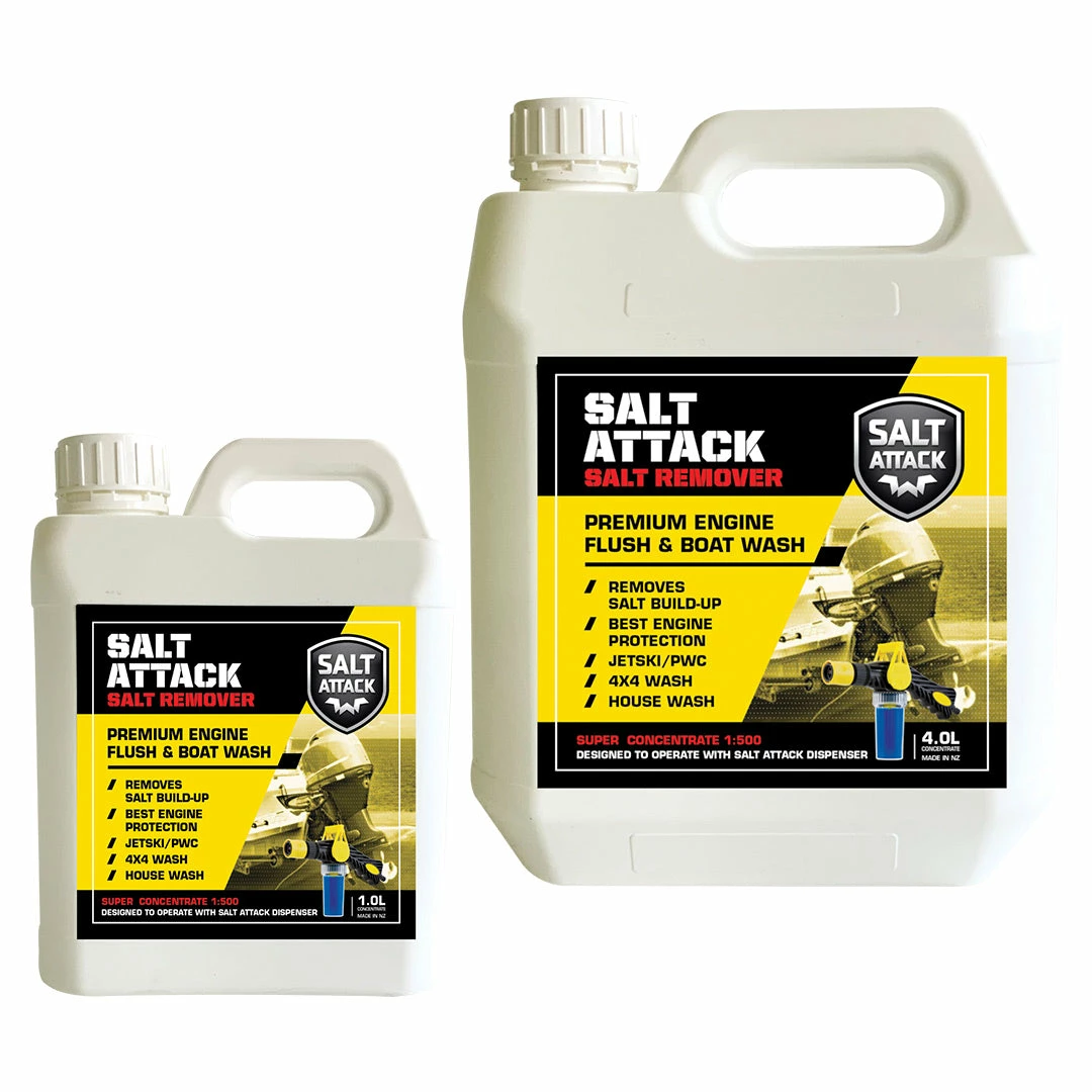 Engine flushing is simple when using the proven Salt-attack mixer, once the motor has been brought up to temperature (if hot flushing), flush salt attack through the engine for 30 seconds to 1 minute. Then shut the motor off, leaving the Salt Attack formula inside the cooling system allowing it to breakdown any accumulated salt.