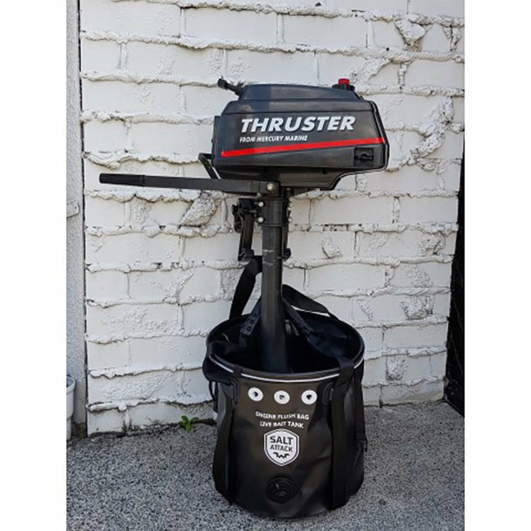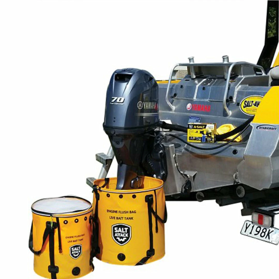 The Salt Attack outboard engine flush bag is a collapsible bag for flushing your outboard engine. Available in four great sizes they are also great for use as a live bait tank.