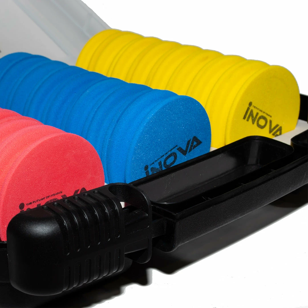 The INOVA Rig Rapper Box set includes a purpose-made storage tackle box and 24 foam rig winders/holders. The Rig Rapper Box is made from strong, lightweight solid plastic and stores 24 included foam Rig Rappers.