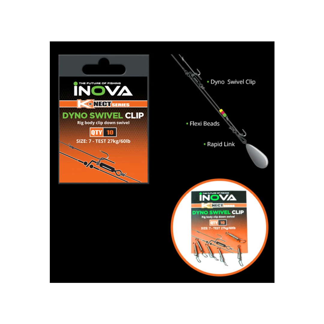 Essential item for surfcasters wanting to uses multiple hooks, the INOVA Dyno Swivel Clip is ideal for using on the body of rigs for clipping down multiple snoods for accurate casting. Releases hook on impact.